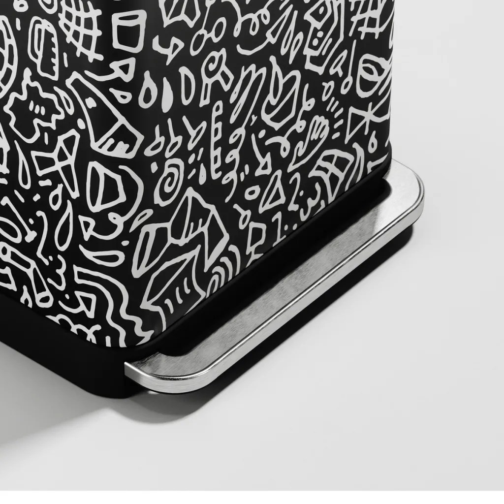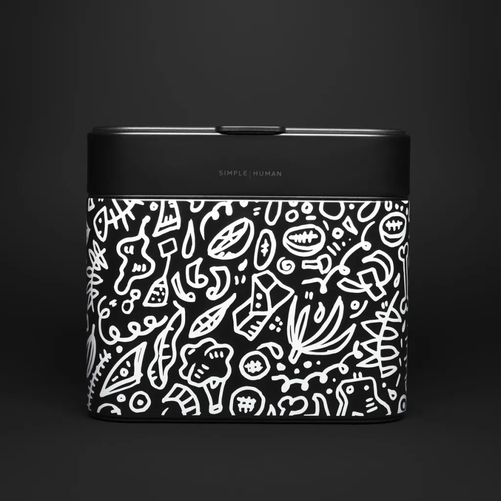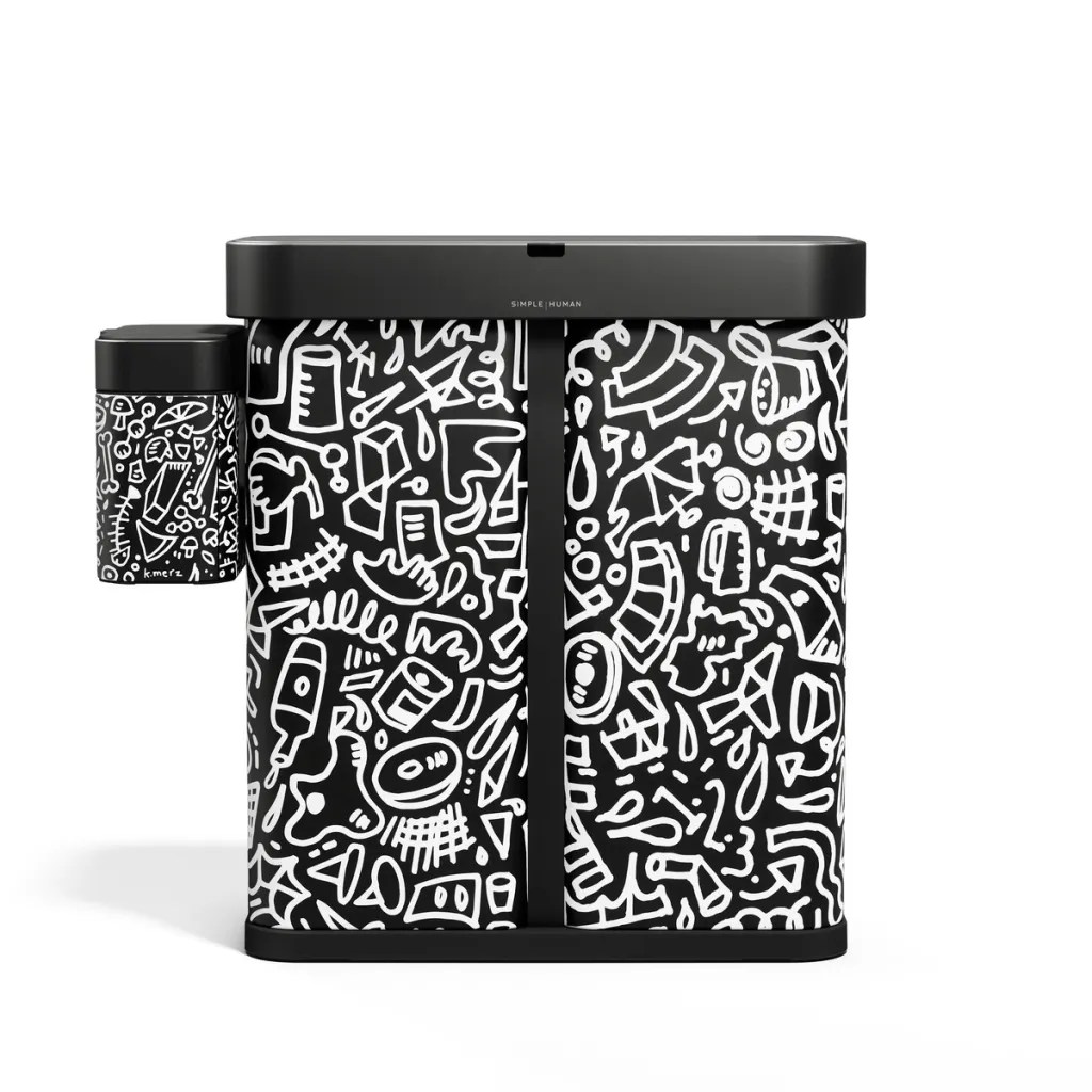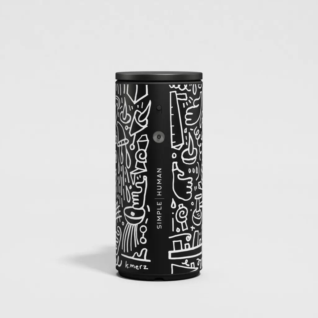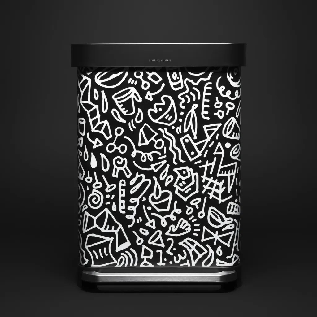 Merz, who is renowned for large-scale murals that feel part-glyph, part-storyboard, brings a playful weight to the collection. Her signature black-and-white linework, referencing architecture, urban signage, and spontaneous mark-making, wraps around Simplehuman staples like their sensor bins and soap dispensers. The limited capsule collection transforms these utilitarian tools into conversation pieces; objects that don’t just blend in, but ask to be noticed.