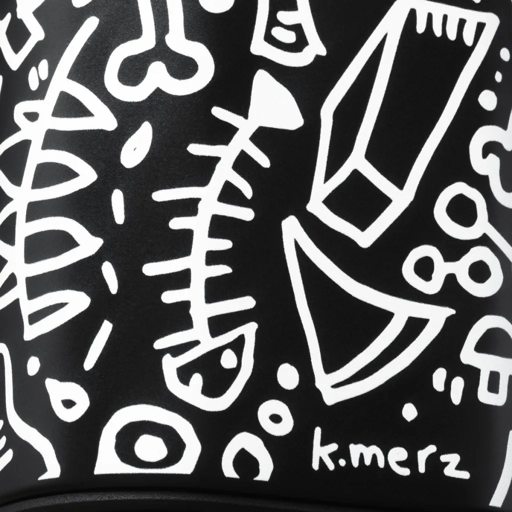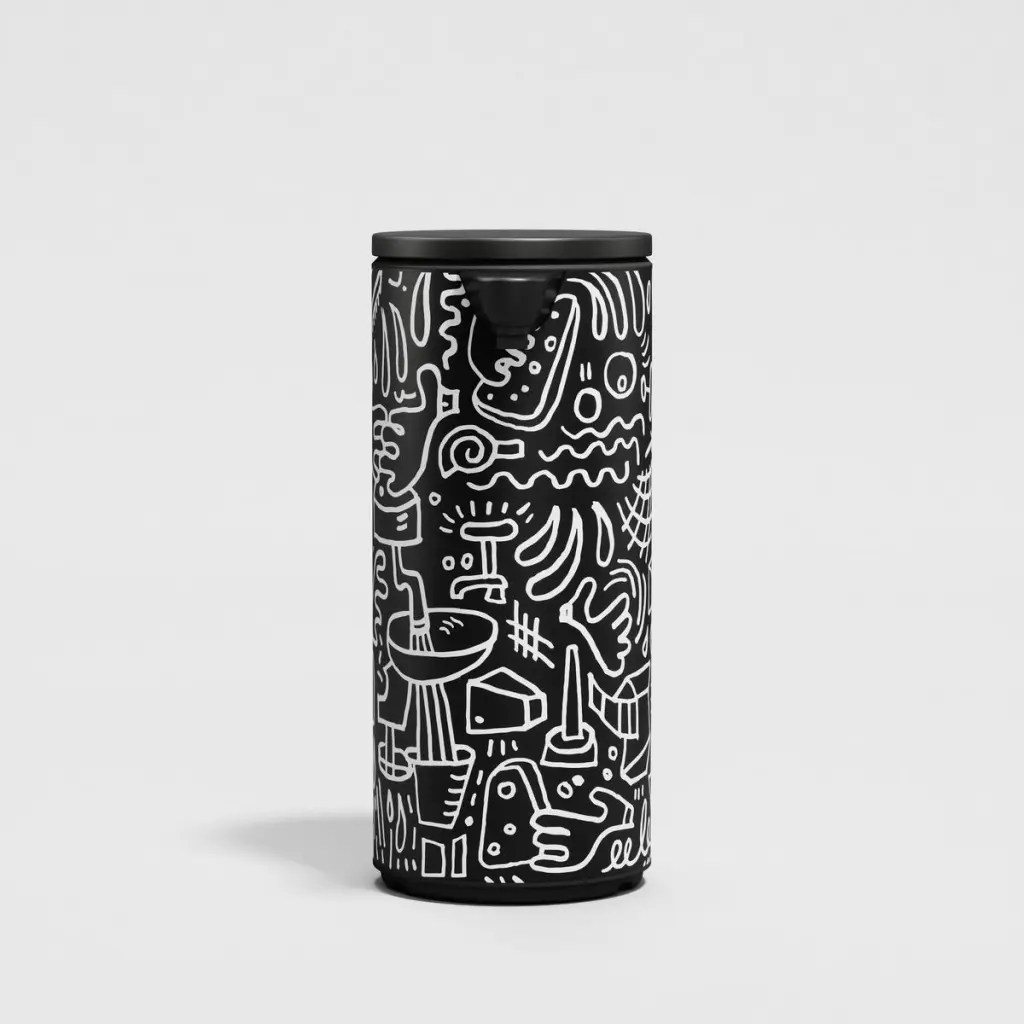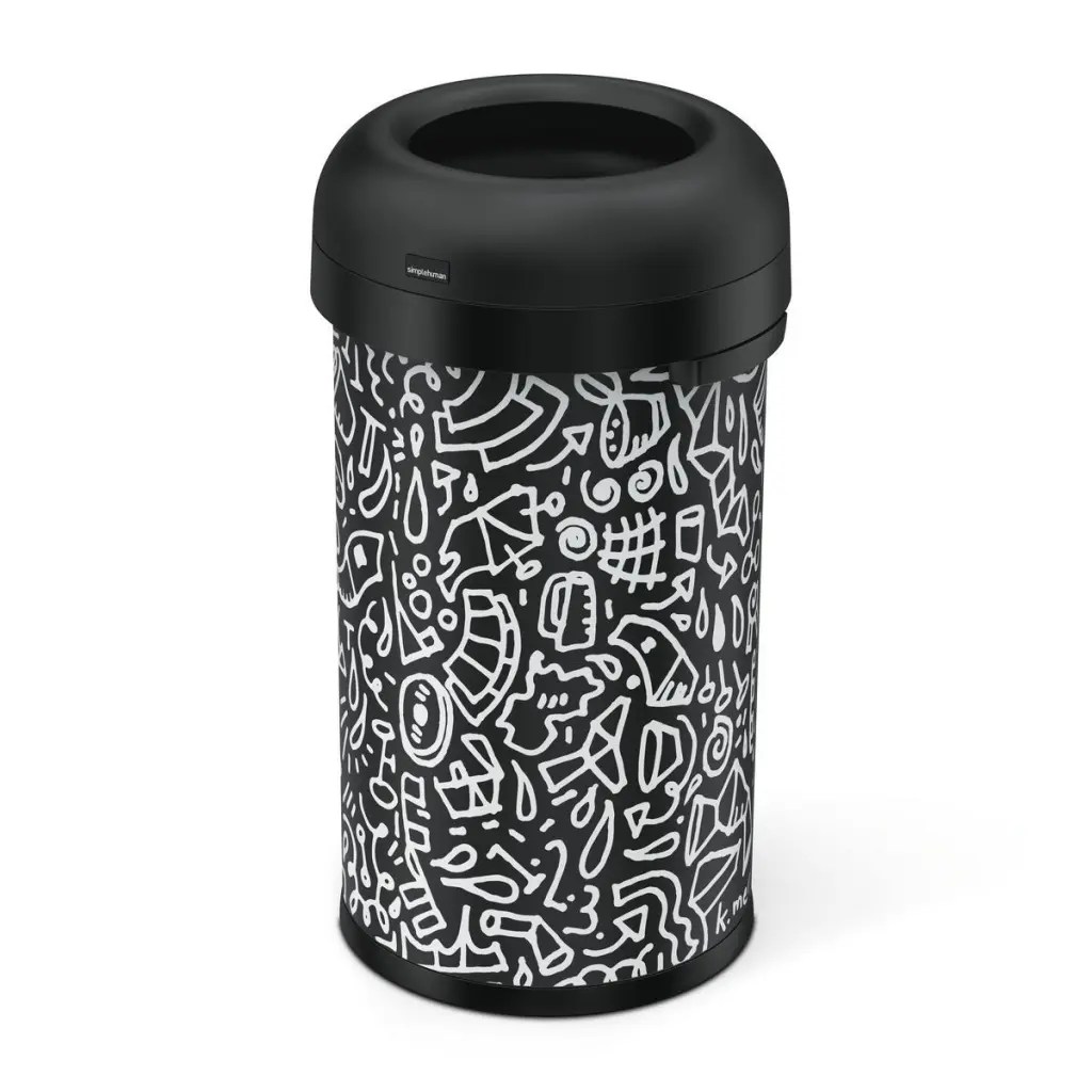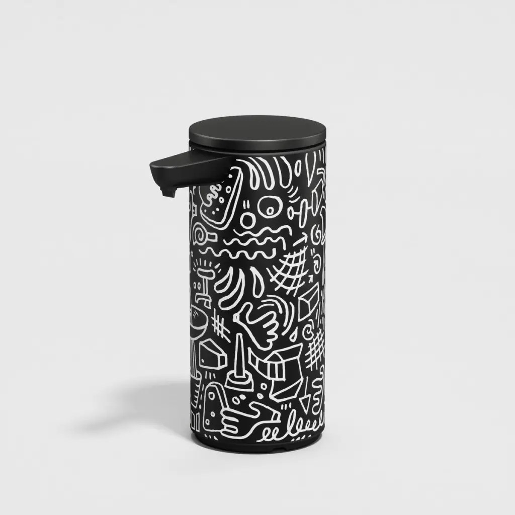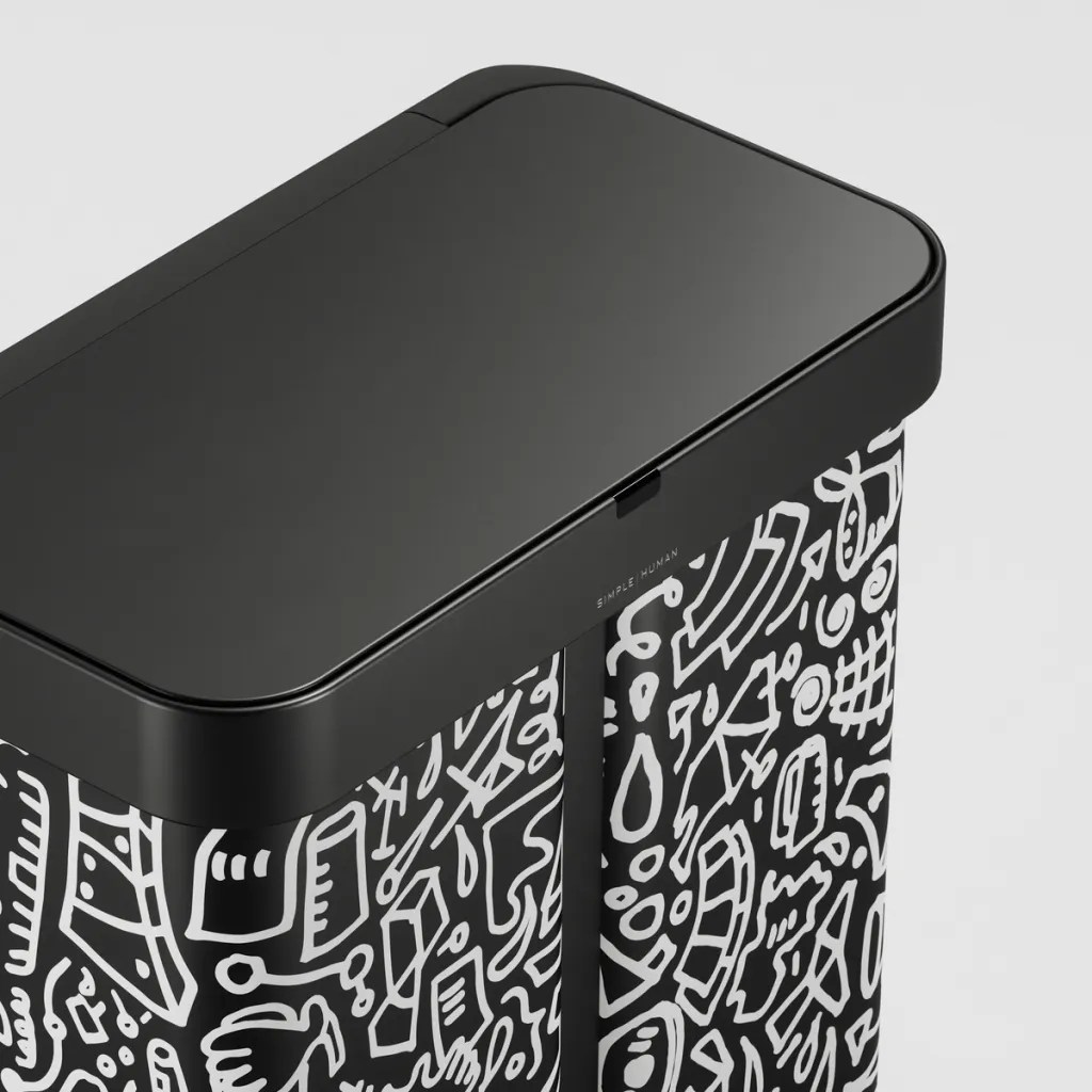 Merz, who is renowned for large-scale murals that feel part-glyph, part-storyboard, brings a playful weight to the collection. Her signature black-and-white linework, referencing architecture, urban signage, and spontaneous mark-making, wraps around Simplehuman staples like their sensor bins and soap dispensers. The limited capsule collection transforms these utilitarian tools into conversation pieces; objects that don’t just blend in, but ask to be noticed.