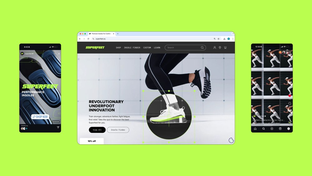 Central to the rebrand is the line “Powered by Superfeet”—less a slogan, more a connective thread running through every touchpoint. The phrase elevates insoles from utility to unseen advantage, a recurring theme in the campaign’s imagery. In one signature visual treatment, x-ray-style CGI reveals the product inside the shoe, transforming an invisible insert into a visual hook.