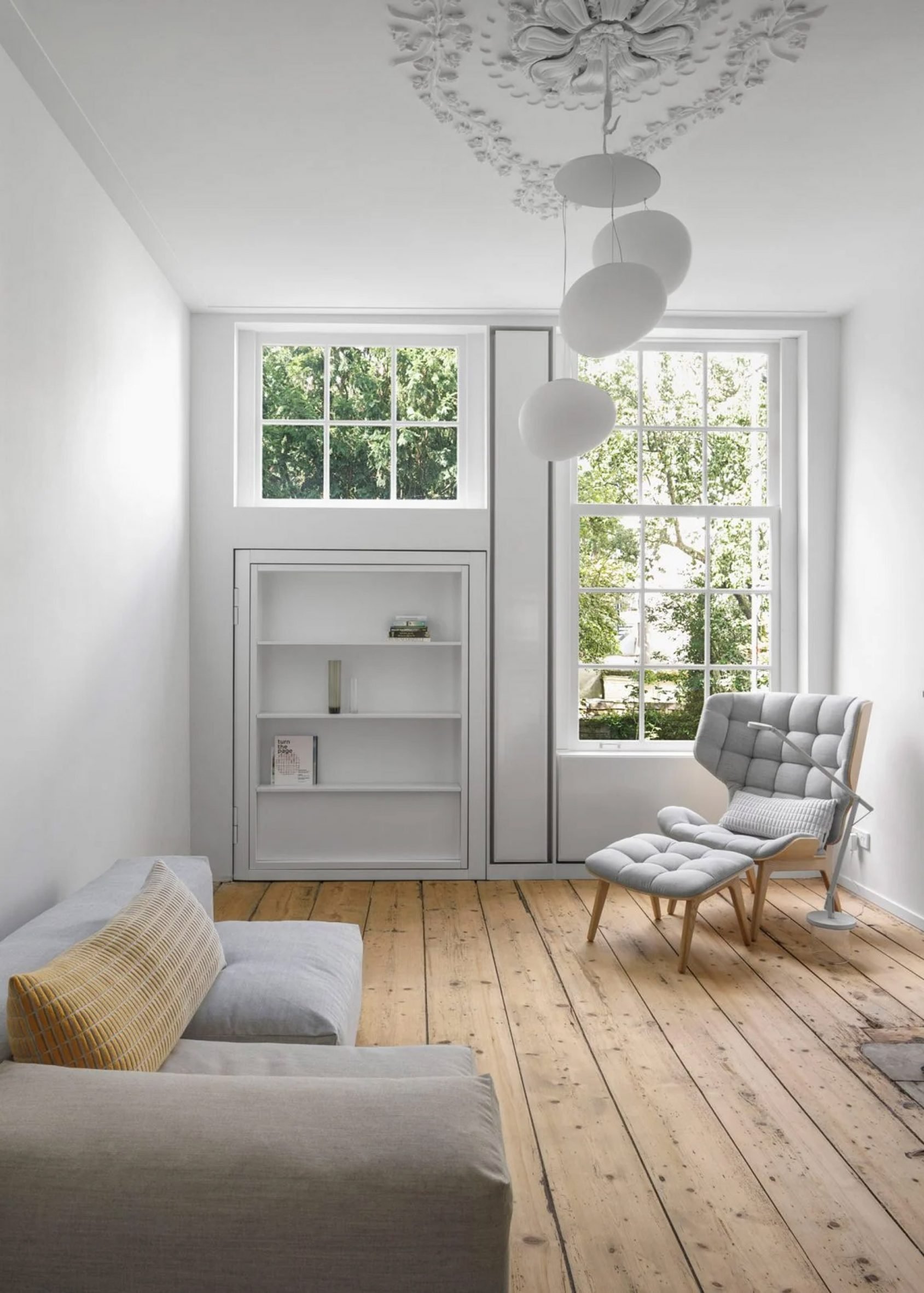 A bookshelf swings open to reveal a hidden snug in this centuries-old canal house renovation in Amsterdam.