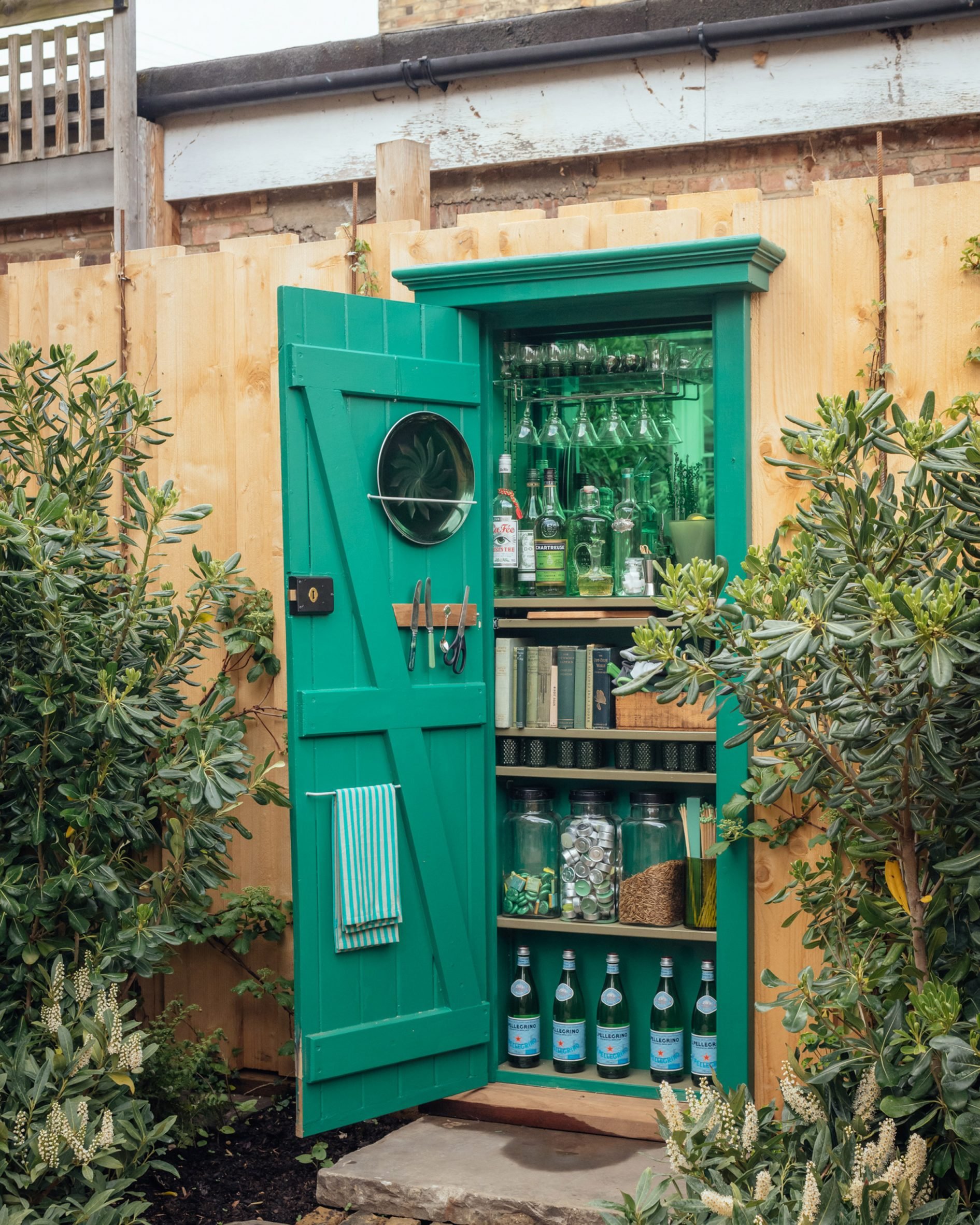 Among other playful touches, the studios upcycled a bright green door frame and added it to a garden wall to create a hidden drinks cabinet.