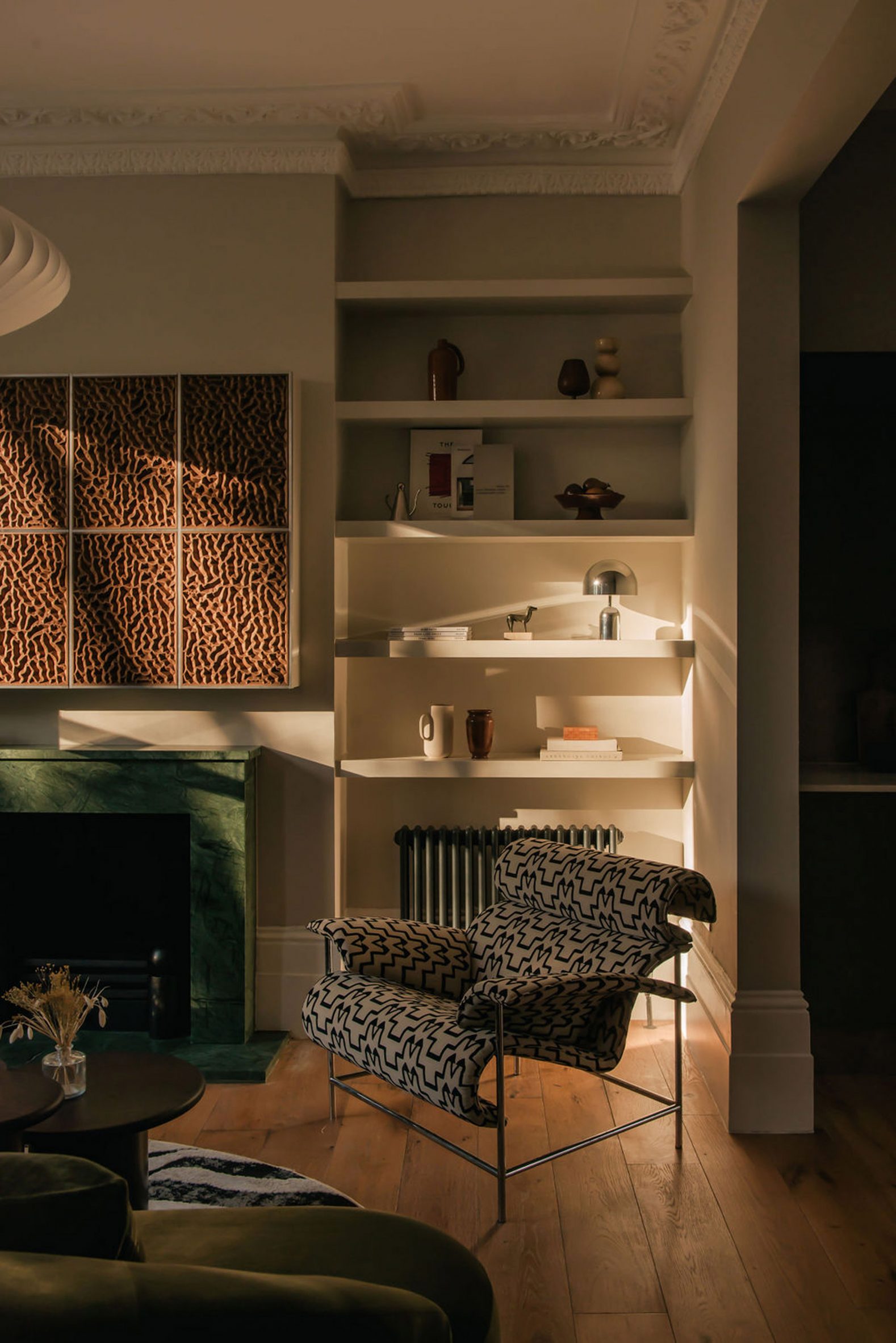 Designer Tom Dixon‘s Bell Portable lamp in silver decorates the living room shelf in this Islington townhouse by design studio Tabitha Isobel.