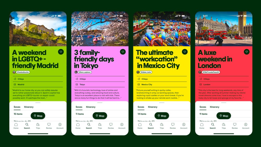 Koto’s design approach reflects intentionality by focusing on texture, emotion, and narrative. The refined color palette anchors the identity in warmth and trust. Tripadvisor Green remains, but it’s been made more vibrant. Trip Pine, a deep, earthy tone, replaces black to convey a sense of reassurance. The secondary colors are pulled from actual user-submitted photos, creating a visual language that feels grounded and lived-in.
