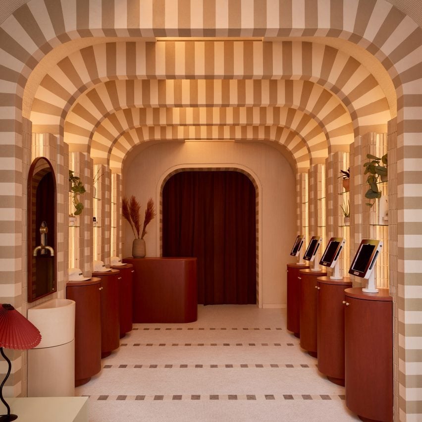 An organic-shaped mirror and a curved salmon-pink tiled wall offer a softer antidote to the space’s more geometric furniture.