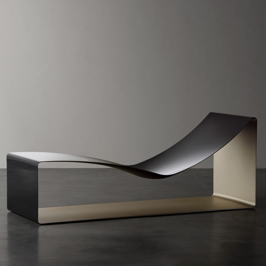 “Created from a duo of mild, rolled stainless steel platforms, the monumental bed features a slit on its side that a removable mirror, television, lamp or side table can slot into.