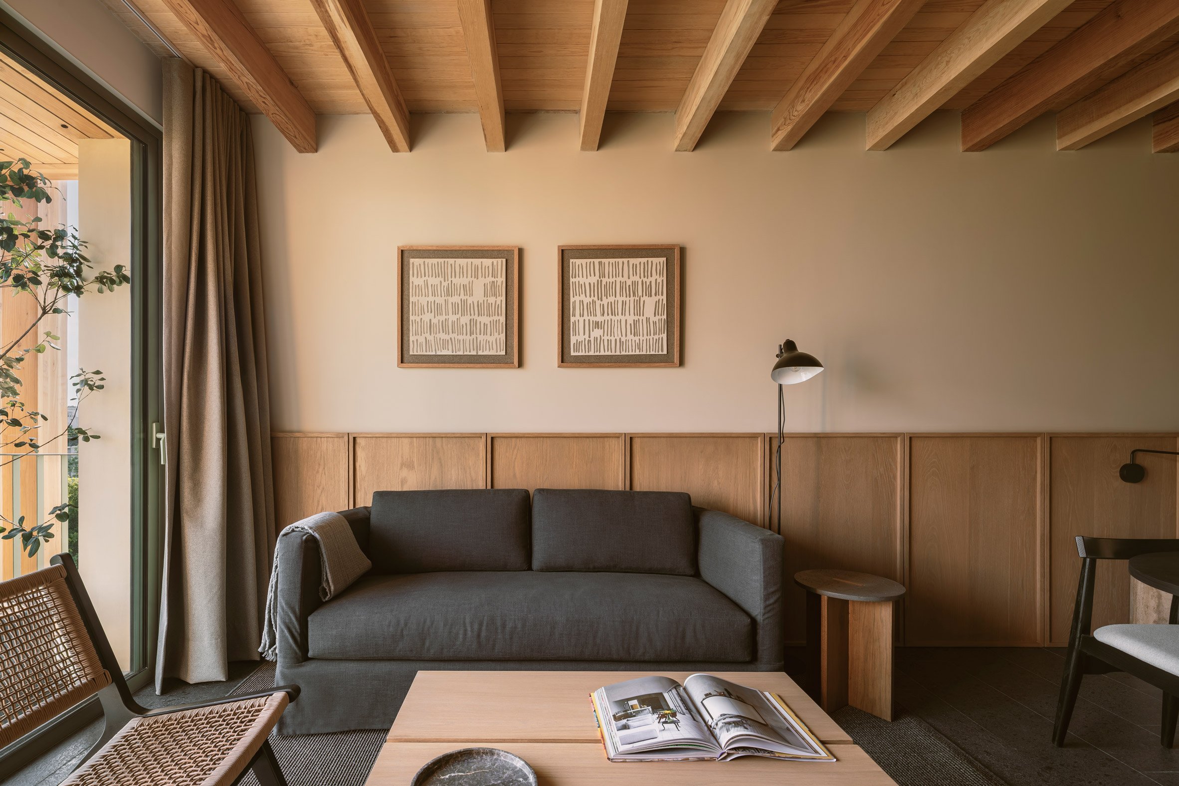 The combination of exposed wood and concrete creates spacious interiors